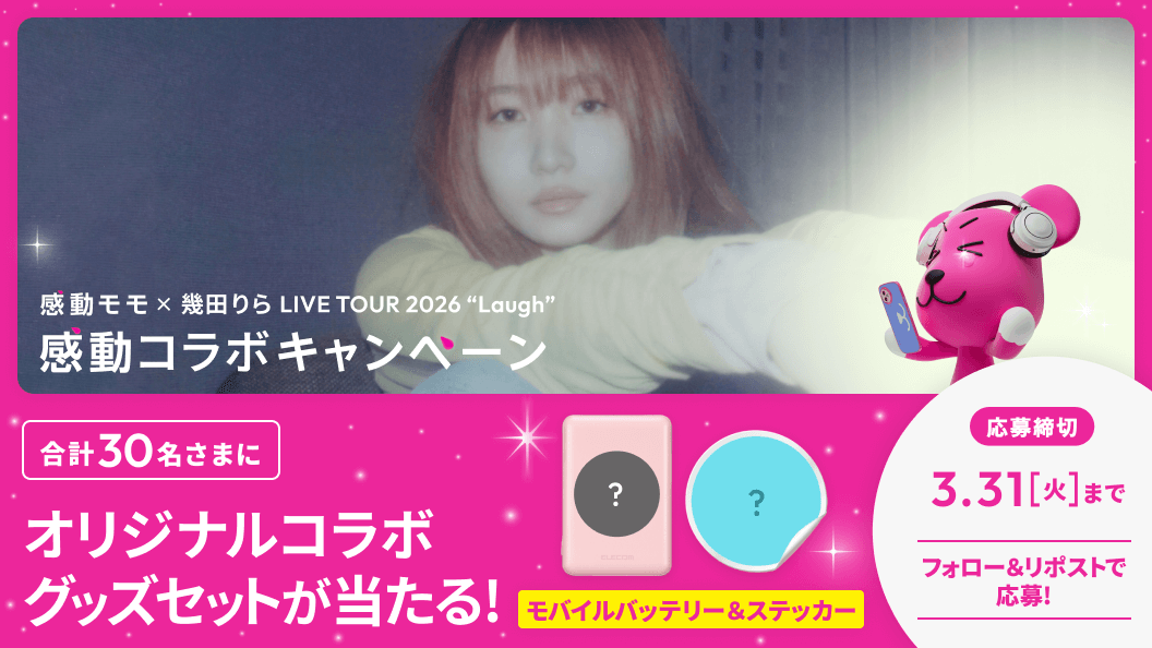 感動モモ×幾田りら LIVE TOUR 2026 "Laugh"オリジナルコラボグッズセットを30名さまにプレゼント。モバイルバッテリー・ステッカーのデザインは届いてからのお楽しみ。