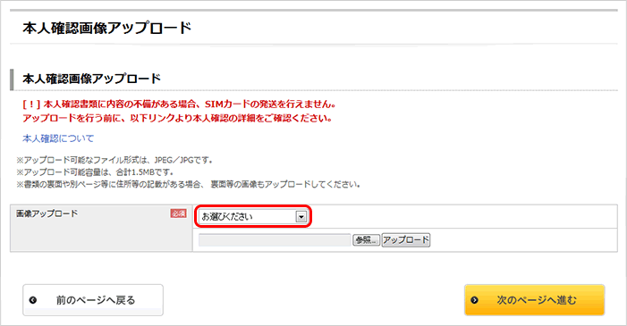 - So-net モバイル LTEお申し込みの際、以下ページの赤枠内からお手持ちの本人確認書類の種類を選択してください。