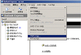 ①Microsoft Outlookを起動後、プルダウンメニューの「ツール」から「アカウント」を選択し、インターネットアカウント画面を表示します。