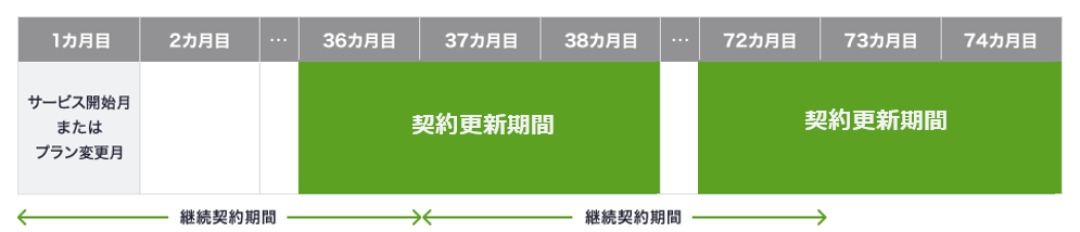 プラン変更完了時にメールでお知らせしている「プラン変更月」を1カ月目とし、そこから36カ月間(3年間)が継続契約期間です。37カ月目から再び3年間の継続契約期間が開始します。更新期間は、36カ月目から3カ月間です。