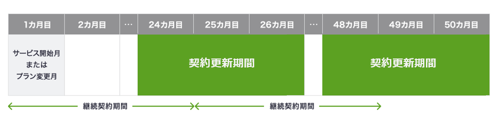 プラン変更完了時にメールでお知らせしている「プラン変更月」を1カ月目とし、そこから24カ月間が2年間の継続契約期間です。25カ月目から再び2年間の継続契約期間が開始します。更新期間は、更新期間は、24カ月目から3カ月間です。