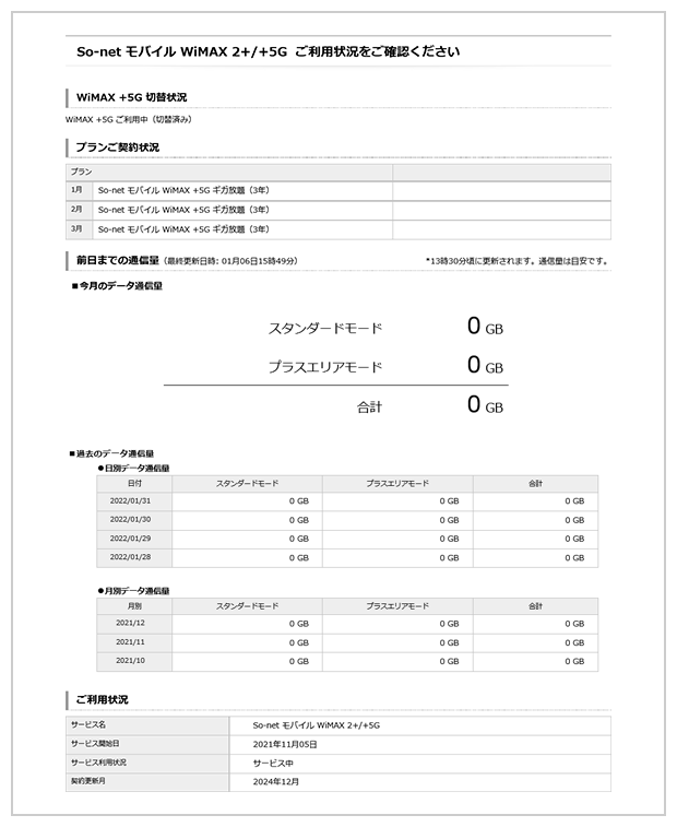 「スタンダードモード」および「プラスエリアモード」の通信量は、マイページの『So-net モバイル WiMAX ご利用状況』からご確認いただけます。