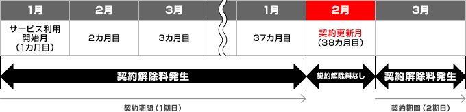 - サービス開始日を含む月を1カ月目として、37カ月目を「満了月」、38カ月目を「更新月」とします。