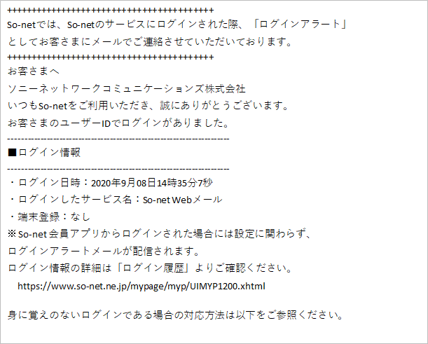 ログインアラートがSo-net以外からなりすまされている事象を確認しました。