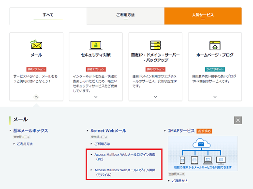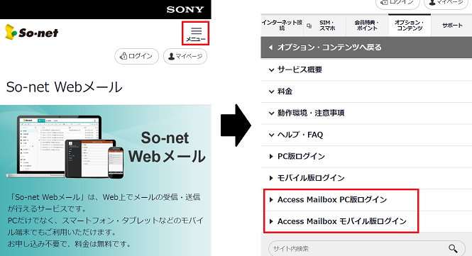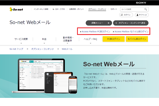 この度、So-net Webメールのログイン画面を専用のログイン画面から、共通のログイン画面に変更させていただくことになりました。これに伴い、So-net Webメールログイン画面に設けておりました、AccessMailboxログイン画面への遷移が利用できなくなります。