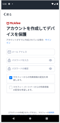 本リリース後、新規にアプリをインストールされる方も、現在インストールしてご利用いただいている方も、下記の「マカフィーアカウントへのサインイン画面」が表示されます。