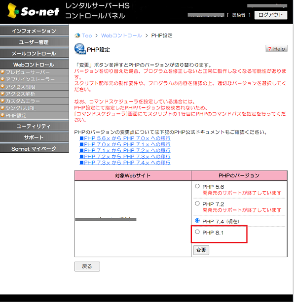 PHP設定の画面で、バージョン8.1を選択し、「変更」ボタンを押してください。