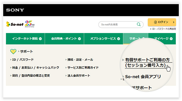 ページ上部グローバルナビの「サポート」内にあるリンク「有償サポートご利用の方(セッション番号入力)」からご利用いただけます。