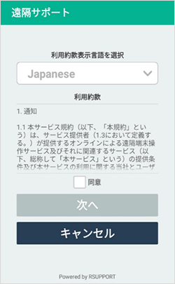 - 遠隔サポートの利用約款が表示されますので、ご確認いただき問題がなければ、「同意」にチェックを入れてください。