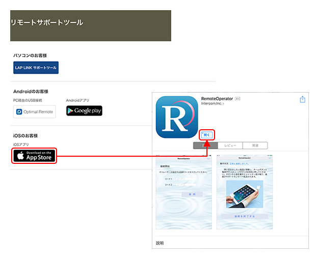 オペレーターからのご案内にしたがって、お客さまの携帯端末にリモートサポートツールをダウンロードします。