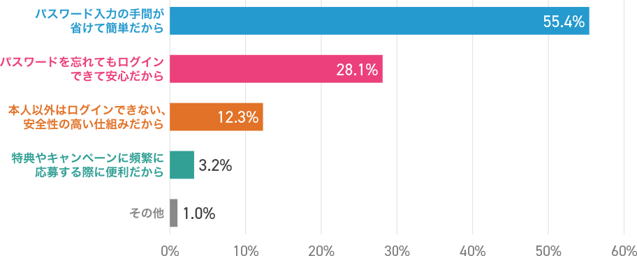 So-net へのログインに生体認証を使って一番良かったと思う理由について、55.4%の方が【パスワードの入力が省けて便利】と回答してくださっています。登録をしておくと、ログイン情報を忘れてしまった時の面倒な再設定がいらなくなるのでおすすめですよ~!