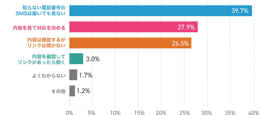 知らない電話番号からのSMSについては【届いても見ない・内容を見て対応を決める・内容は確認するがリンクは開かない】という方が全体の94.1%!