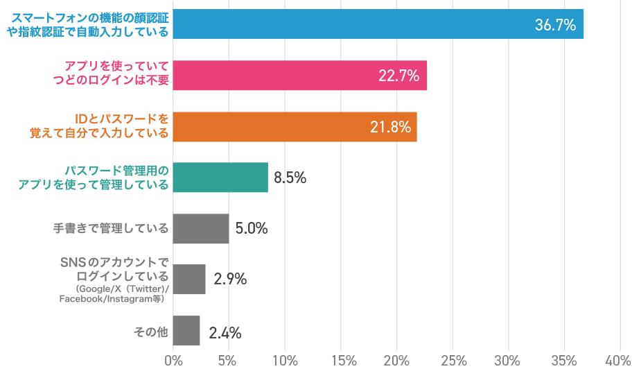 スマホからのアプリ・ウェブサイトへのログイン方法としては生体認証・アプリが全体の半数以上を占めています。