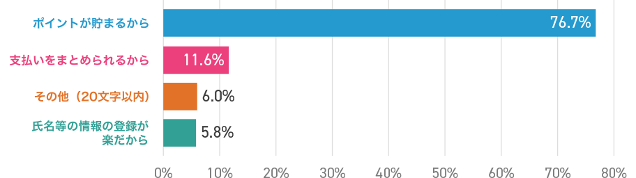 オンライン決済やアプリの支払い・会員登録に使ったことがある支払いサービスはいろんな決済方法がある中、PayPayが多いですね~!払いサービスを利用している理由は、【ポイントが貯まるから】と答えた方が76.7%!