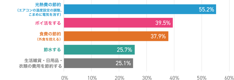 現在節約のために取り組んでいることについては、回答者の約4割がポイ活を実施していらっしゃいますね!