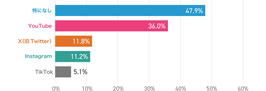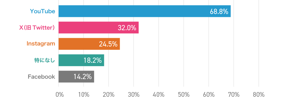 普段利用しているSNS・動画配信サービスでは約7割の方がYoutubeを利用しているとのことで圧倒的に多いですね。次に多いのがX(旧Twitter)でした。