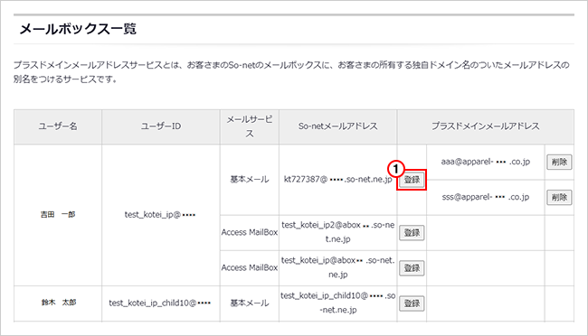 本会員ID・管理責任者IDのSo-netアドレス(xxx@xx.so-net.ne.jp)には、管理者用のアドレスとして「postmaster@独自ドメイン名」が自動で登録されます。(料金は無料です)