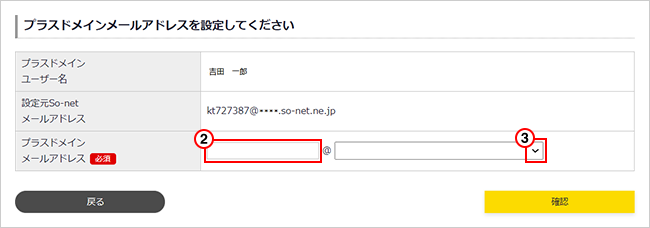 ②「プラスドメインメールアドレス」欄の@より前に任意の文字列を入力する。