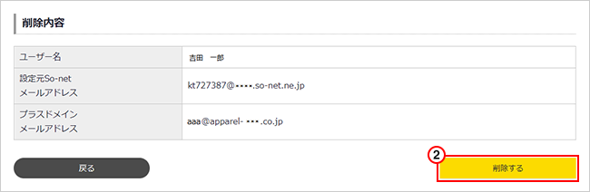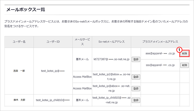 メールアドレスの一覧表示と確認、プラスドメインメールアドレスの削除などは、下記ボタンよりご利用ください。