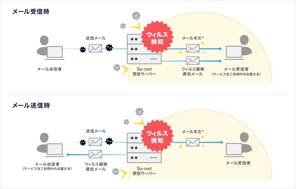 メールボックスで受信する前に、So-netのメールサーバ上でメールに添付されたファイルのチェックを行い、ウイルスが検知された場合は自動的に駆除します。ウイルス対策ソフトは不要で、安心してメールを受信することができます。