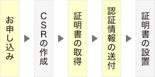 下記フローの「お申し込み」「証明書の取得」「認証情報の送付」がお客様にご実施いただく作業となります。詳細は各サービスページを確認ください。