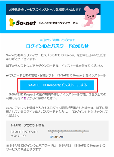 本サービス利用開始後にご登録いただいたメールアドレス宛に、safeavenue@f-secure.com より本サービスのインストールに関するご案内を記載したメールをお送りします。メール本文にある「S-SAFE ID Keeperをインストールする」をクリックしてください。