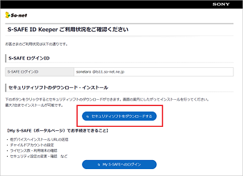 申込完了ページ、利用開始ページまたは利用状況確認ページにある「セキュリティソフトをダウンロードする」ボタンをクリックしてください。