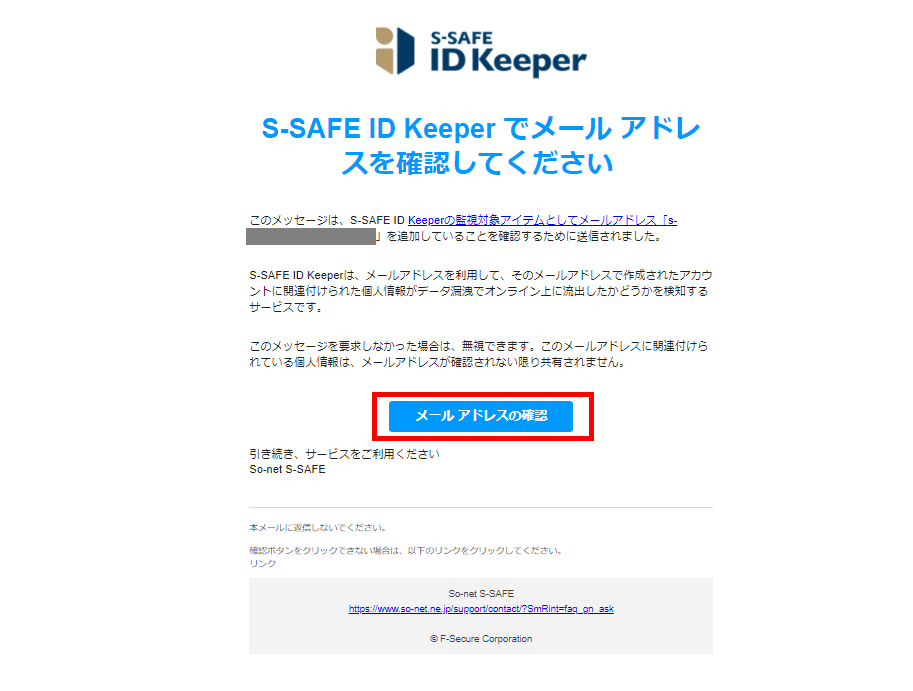 お申し込み時に登録したメールアドレスは、本サービスが利用開始すると、監視対象メールアドレスおよび流出を検知した際の連絡先メールアドレスとして、エフセキュア社により本サービスに自動的に登録されます。(この設定は後から変更することができます)
