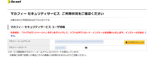 マカフィー セキュリティサービスをお申し込み完了後、画面の案内にしたがって「マイアカウントページへ」進み、インストールしてください。