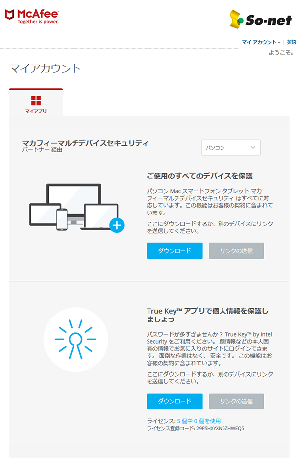 すでにマカフィーセキュリティサービスのセキュリティソフトをインストールしているデバイスがある場合は、マイアカウントページにログインせずに、2台目以降のデバイスへのインストールが可能です。