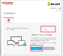 マイアカウンページが表示されたら、右上のプルダウンで、[パソコン]が選択されていることを確認し、[ダウンロード]をクリックしてください。