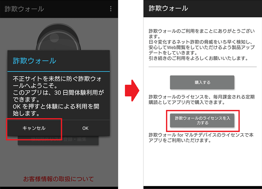 ※Androidをご利用のお客さま使用許諾書に同意していただき、「体験版利用」メッセージが表示されましたら、体験版は利用しないので「キャンセル」をクリックしてください。また、次に表示される画面では、必ず「internet sagiwallライセンスを入力する」をクリックしてください。