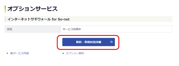「オプションサービスサービス」欄の「インターネットサギウォール for So-net」の「契約・利用状況詳細」をクリック