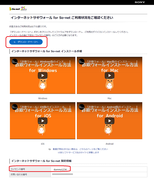 「インターネットサギウォール for So-net ご利用状況をご確認ください」画面で「ダウンロードへ」ボタンをクリック