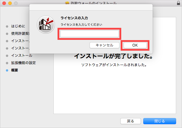 使用許諾契約書を確認後、「インストール」を押下し、お使いのMacに設定しているパスワードを入力し、[ソフトウェアをインストール]をクリックすると表示