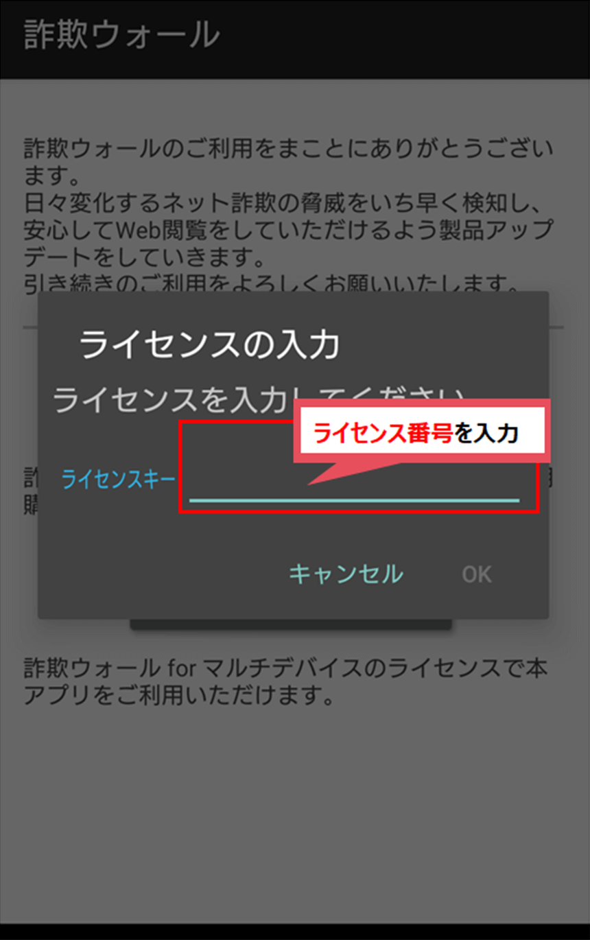※Androidをご利用のお客さま使用許諾書に同意していただき、「体験版利用」メッセージが表示されましたら、体験版は利用しないので「キャンセル」をクリックしてください。また、次に表示される画面では、必ず「internet sagiwallライセンスを入力する」をクリックしてください。