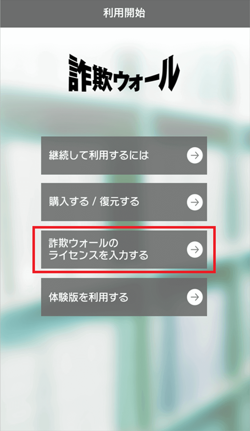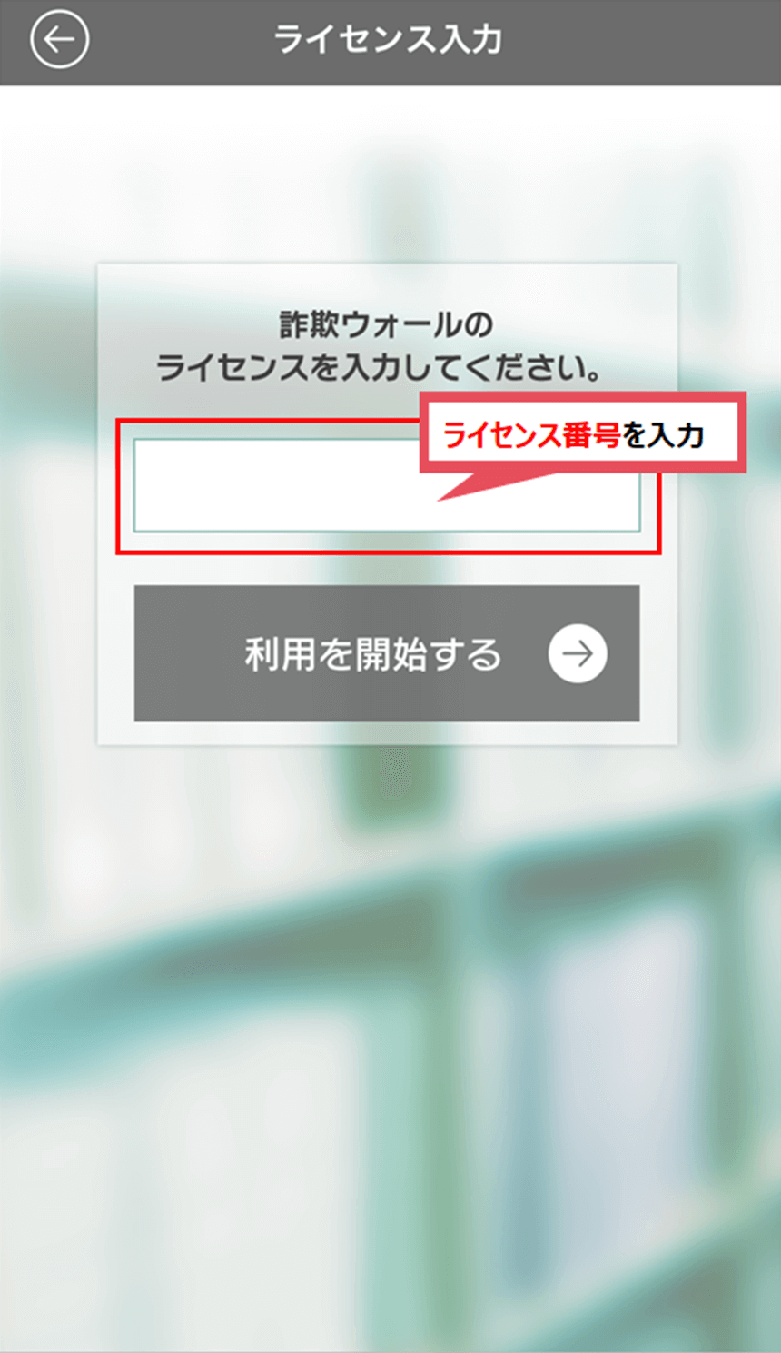使用許諾契約書を確認し、「Internet SagiWallのInternet SagiWallのライセンスを入力する」ボタンをタップすると表示