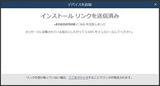送信済みの画面が表示されます。メールまたはSMSが届いていない場合は、下部にある「ここをクリック」をクリックするとインストールメールが再送されます。