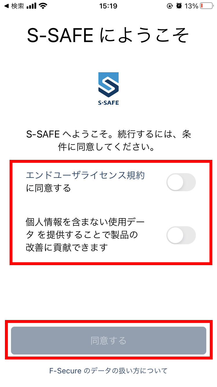 S-SAFEのアプリが起動されたら、「エンドユーザライセンス規約に同意する」にチェックを入れて「同意する」をタップしてください。