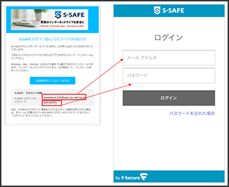 S-SAFE ログインIDあてにsafeavenue@f-secure.com より「【重要】S-SAFE ログインIDとパスワードのお知らせ」というメールが届きます。メール本文にある「S-SAFEをインストールする」をクリックしてください。