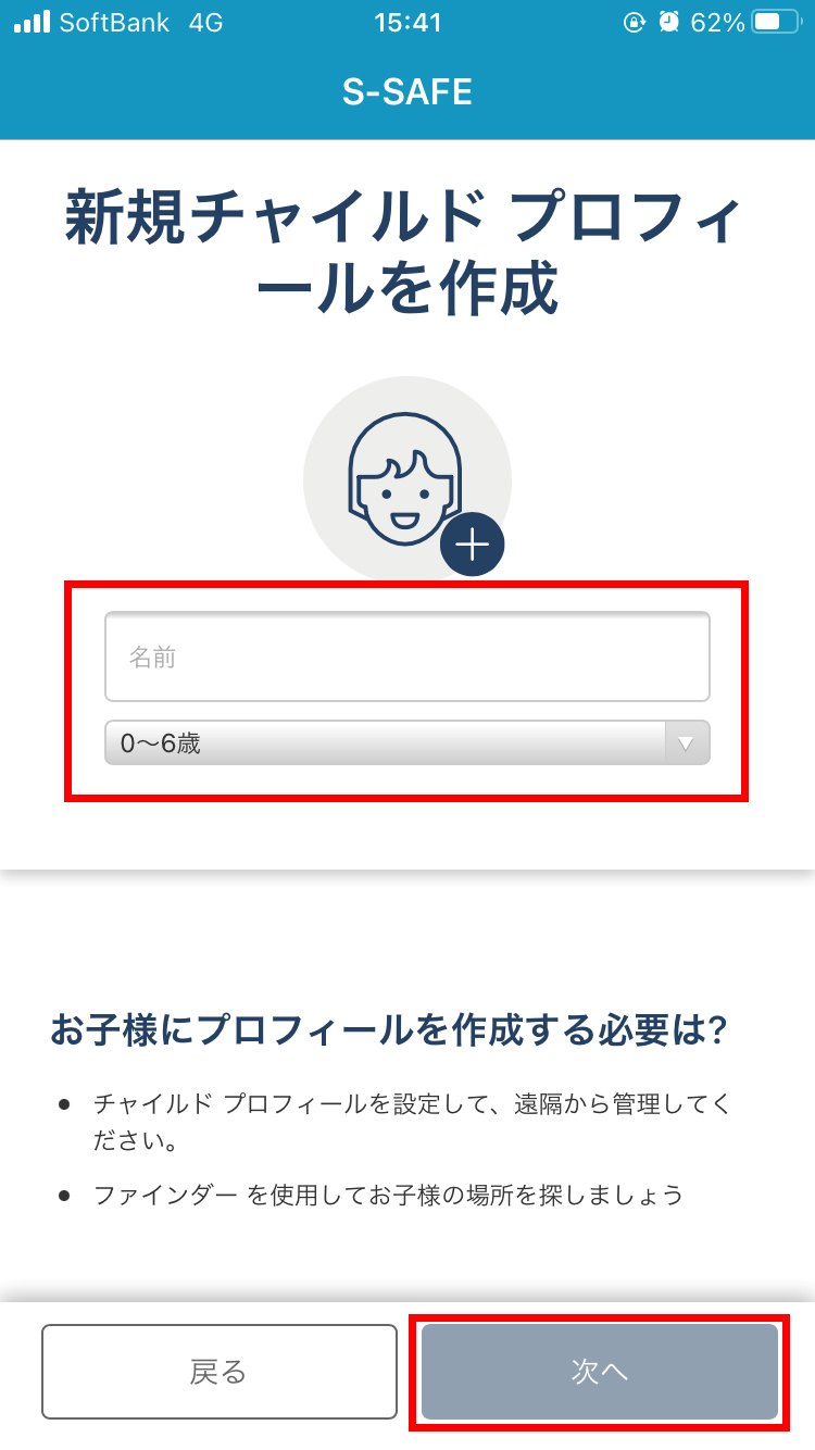 「名前」を入力し、「年齢グループ」を選択し「次へ」をタップしてください。