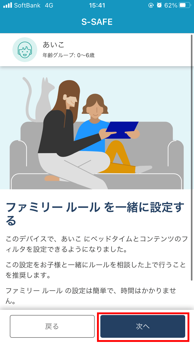 「ファミリールールを一緒に設定する」の画面が表示されますので、「次へ」をタップしてください。