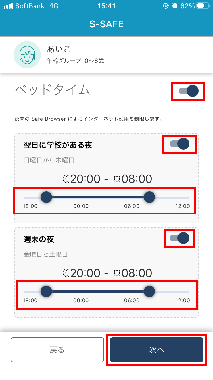 「ベッドタイム」の設定画面が表示されますので、夜間のSafe Browserでのインターネット使用を制限したい場合は、時間制限機能をオンにしたうえ、利用時間を設定し、「次へ」をタップしてください。