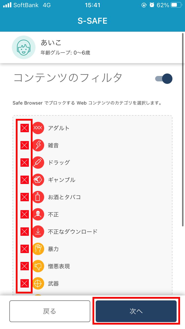「コンテンツのフィルタ」の画面が表示されますので、オンにしたうえ、ブロックしたいwebサイトを設定し、「次へ」をクリックしてください。