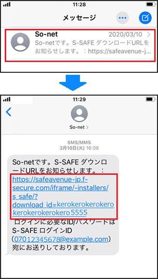So-netにご登録いただいている携帯電話番号あてに、S-SAFEのダウンロードURLをSMSでお送りします。本文中のURLをクリックしてインストールを行ってください。