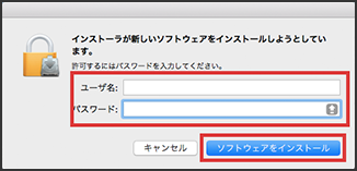 ご利用のMacでお使いのユーザ名とパスワードを入力します。次に、「ソフトウェアをインストール」をクリックしてください。