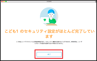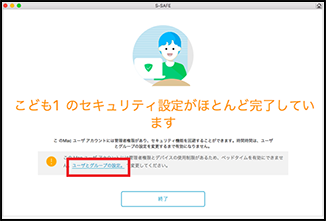 Macの管理者アカウントでログインすると「ユーザとグループの設定」変更案内が表示されます。「ユーザとグループの設定」をクリックして、お子さまのログインIDでのMacの管理設定を無効にしてください。設定しない場合、ファミリールールで設定した制限時間になっても、お子さまのアカウントで利用時間の追加等ができる状態となります。
