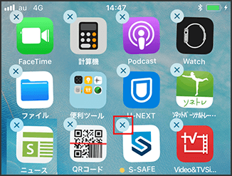 アイコンが震え始めたら指を離し、削除したいアプリの左上に表示されている[×]ボタンをタップします。