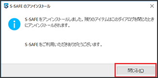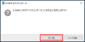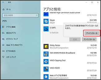 アプリのリストでS-SAFEを選択し、[アンインストール]をクリックします。