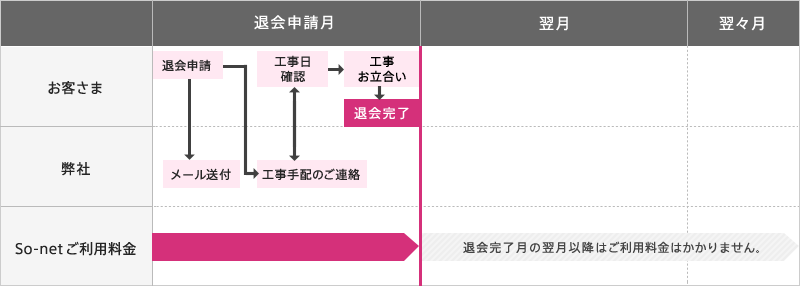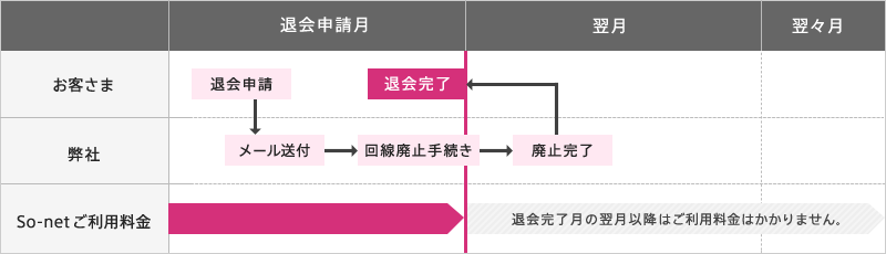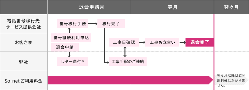 「So-net 光 電話」の電話番号継続手続き完了後、お客さまと弊社で取り決めさせていただく廃止工事月の月末の退会となります。